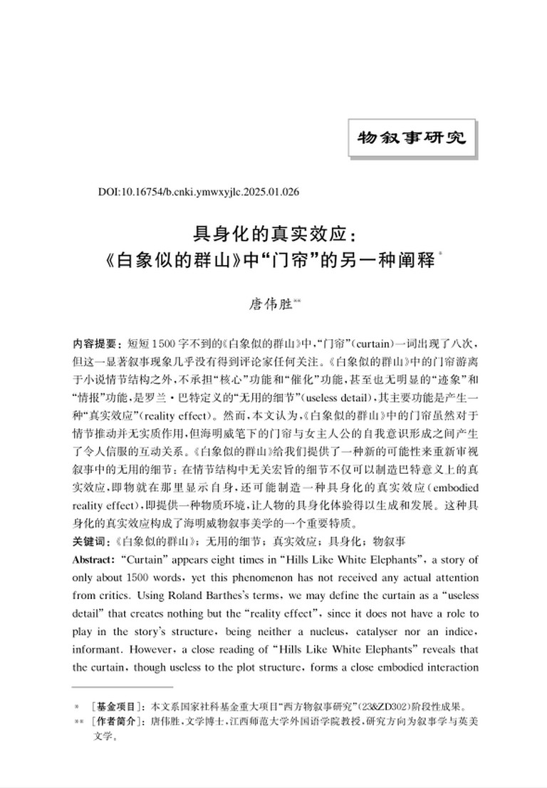 唐伟胜教授撰写的论文《具身化的真实效应:<白象似的群山>中“门帘”的另一种阐释》刊发于《英美文学研究论丛》2025年第1期上。在不足1500字的《白象似的群山》中,“门帘”一词出现八次,却鲜受评论界关注。而本文认为,《白象似的群山》中的“门帘”虽然对于情节推动并无实质作用,但海明威笔下的门帘与女主人公的自我意识形成之间产生了令人信服的互动关系。《白象似的群山》给我们提供了一种新的可能性来重新审视叙事中的无用的细节:在情节结构中无关宏旨的细节不仅可以制造巴特意义上的真实效应,即物就在那里显示自身,还可能制造一种具身化的真实效应(embodied reality effect),即提供一种物质环境,让人物的具身化体验得以生成和发展。这种具身化的真实效应构成了海明威物叙事美学的一个重要特质。