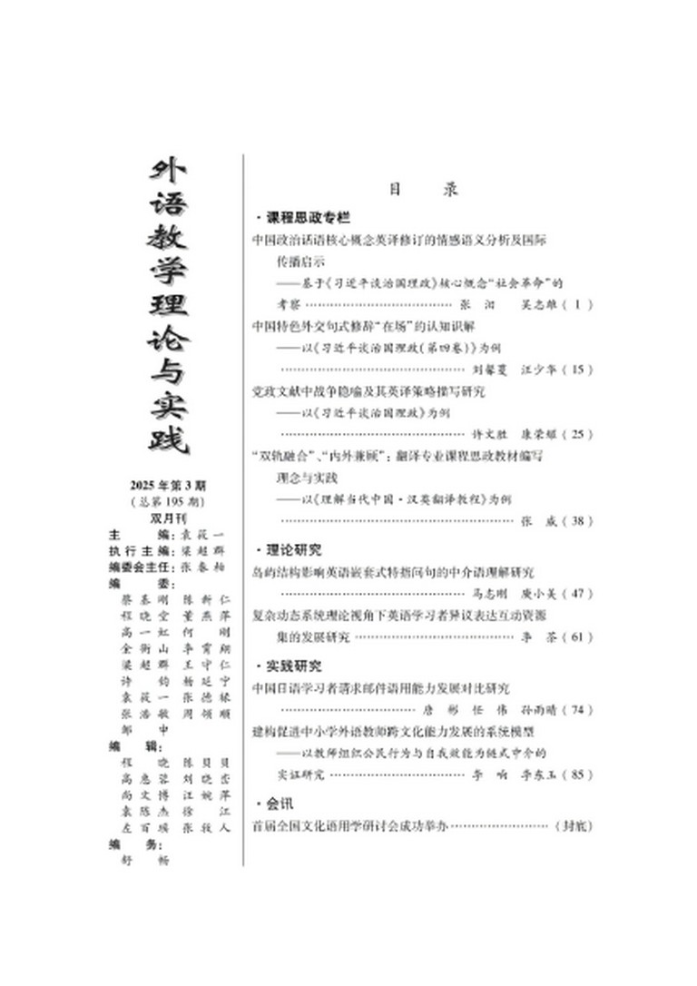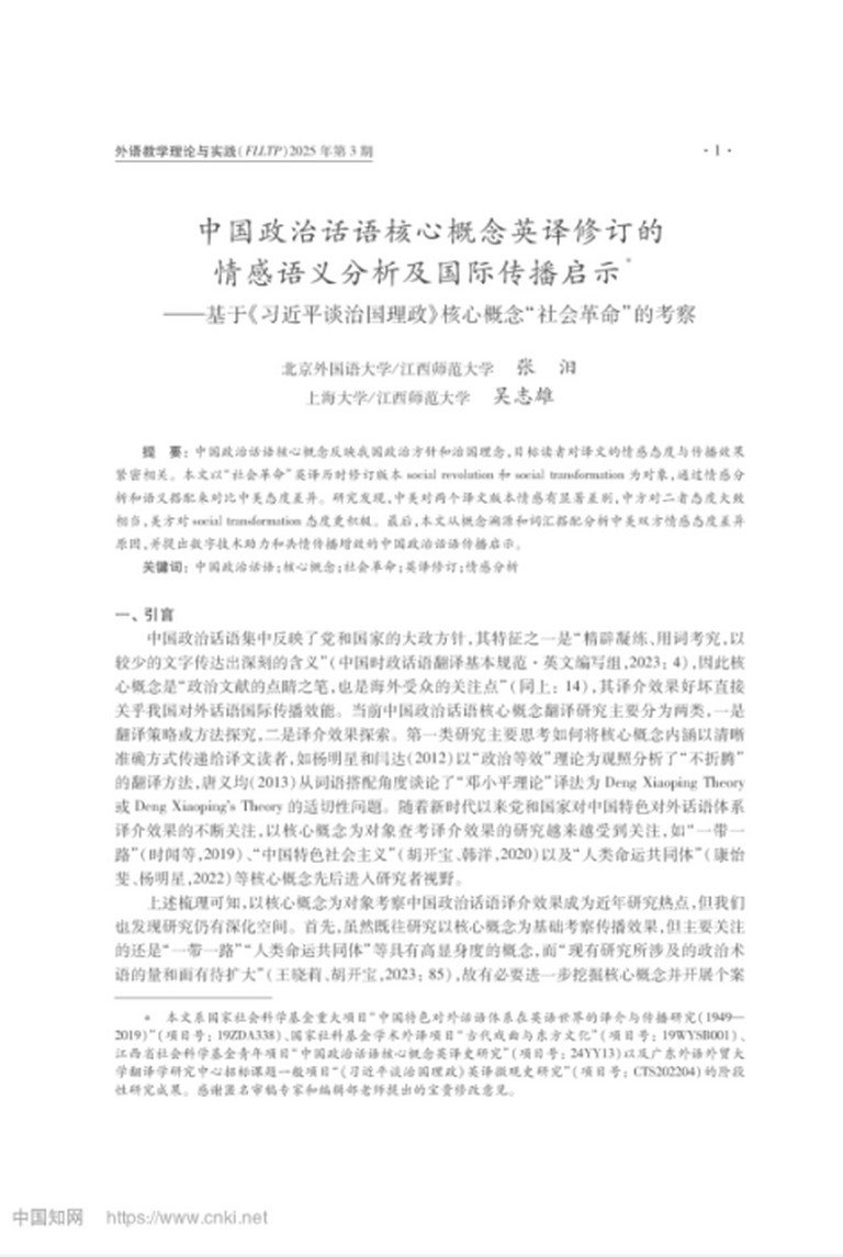 张汨副教授与我院2024届本科生吴志雄(现上海大学硕士研究生在读)合作的论文《中国政治话语核心概念英译修订的情感语义分析及国际传播启示——基于<习近平谈治国理政>核心概念“社会革命”的考察》刊发于《外语教学理论与实践》2025年第3期上。该论文以“社会革命”英译历时修订版本social revolution和social transformation为对象,通过情感分析和语义搭配来对比中美态度差异。研究发现,中美对两个译文版本情感有显著差别,中方对二者态度大致相当,美方对social transformation态度更积极。并从概念溯源和词汇搭配分析中美双方情感态度差异原因,提出数字技术助力和共情传播增效的中国政治话语传播启示。