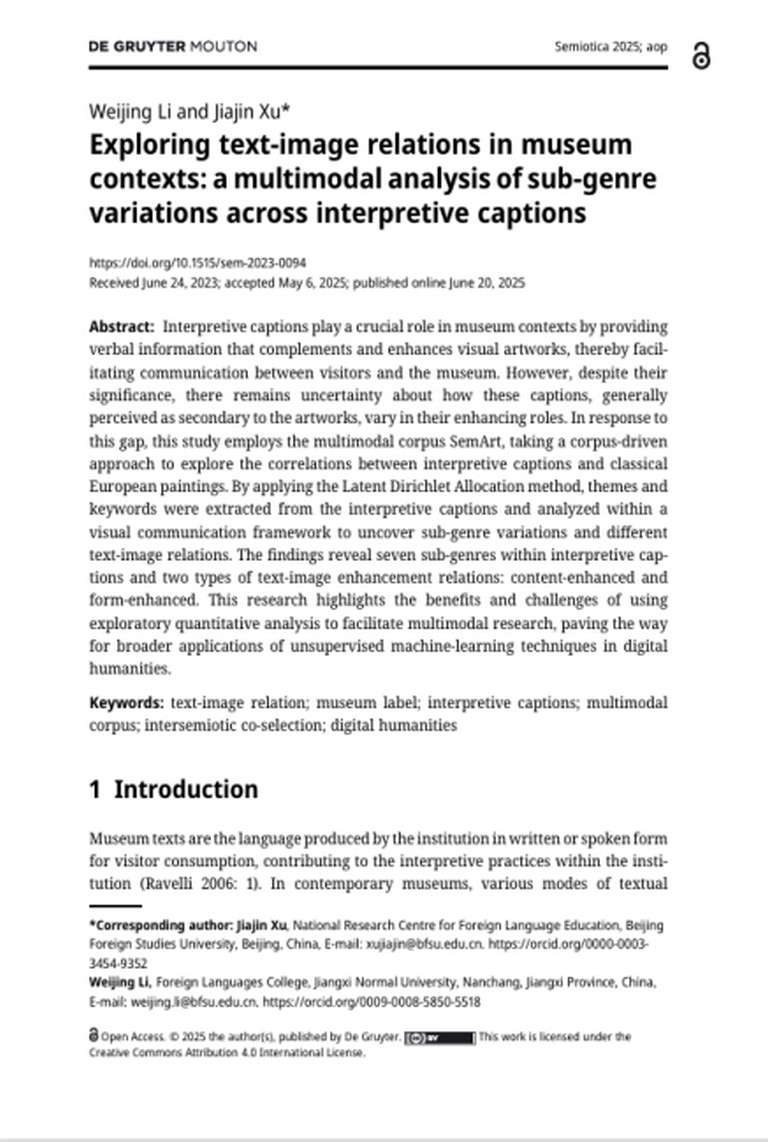 李维静博士与北京外国语大学许家金教授合作的论文Exploring text-image relations in museum contexts: a multimodal analysis of sub-genre variations across interpretive captions于2025年6月在线发布在符号学权威期刊Semiotica上。该研究基于多模态语料库SemArt,运用LDA主题建模技术分析欧洲古典绘画的展览标签,探索标签文本与绘画图像间的关系。文章从文本出发,自下而上地提炼出标签文本的七个主题类型,揭示了其对画作的两种增强关系:“内容增强”与“形式增强”。该项研究突显了使用探索性定量分析促进多模态研究的益处和挑战,是无监督机器学习技术在数字人文领域的一次尝试。