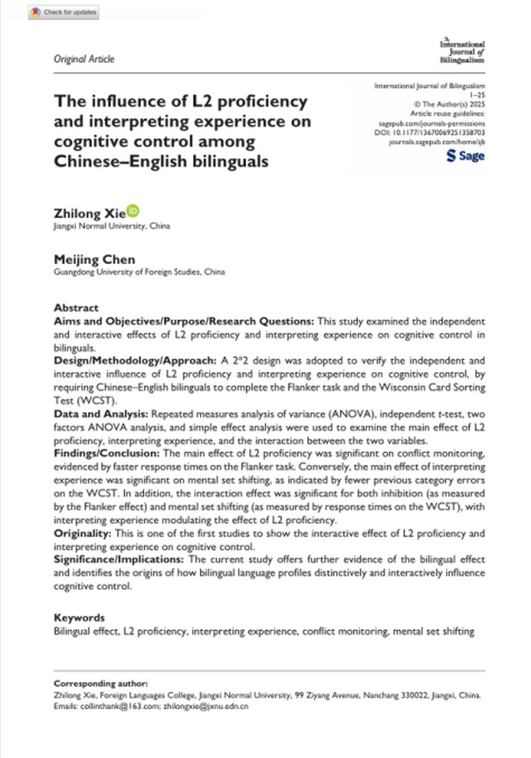 谢枝龙教授与我院2023届硕士研究生陈美静(现广东外语外贸大学博士在读)合作的论文The influence of L2 proficiency and interpreting experience on cognitive control among Chinese–English bilingual发表于语言学权威刊物International Journal of Bilingualism的2025年第4期上。研究采用2(L2熟练度:高/低)× 2(口译经验:有/无)被试间设计,通过Flanker任务和威斯康星卡片分类测试(WCST),考察汉语-英语双语者的二语熟练程度与口译经验对认知控制的独立与交互效应。该论文是最早揭示L2熟练度与口译经验对认知控制的交互影响的研究之一,深化了对双语效应背后认知机制的理解。