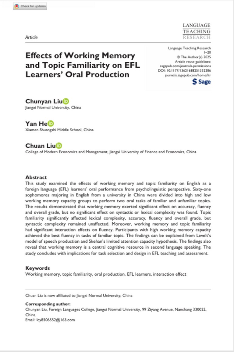 刘春燕教授与我院2023届硕士研究生何艳、我校在读博士研究生刘川合作的论文Effects of Working Memory and Topic Familiarity on EFL Learners’ Oral Production发表于语言学权威期刊Language Teaching Research的2025年第7期上。该研究从心理语言学的视角出发,以61名中国高校英语专业学生为对象,考察了工作记忆与话题熟悉度对外语学习者的口语表现的影响。结果表明,工作记忆显著影响口语的准确度、流利度和整体表现,但对句法和词汇复杂度影响不大。话题熟悉度对词汇复杂度、准确度、流利度及整体评分均有显著促进作用,但句法复杂度则未受到明显影响。此外,工作记忆与话题熟悉度在流利度上存在显著交互作用。研究进一步指出,工作记忆是二语口语表达的核心认知资源。这项研究为在外语教学及评估中的任务选择和设计提供了重要启示。