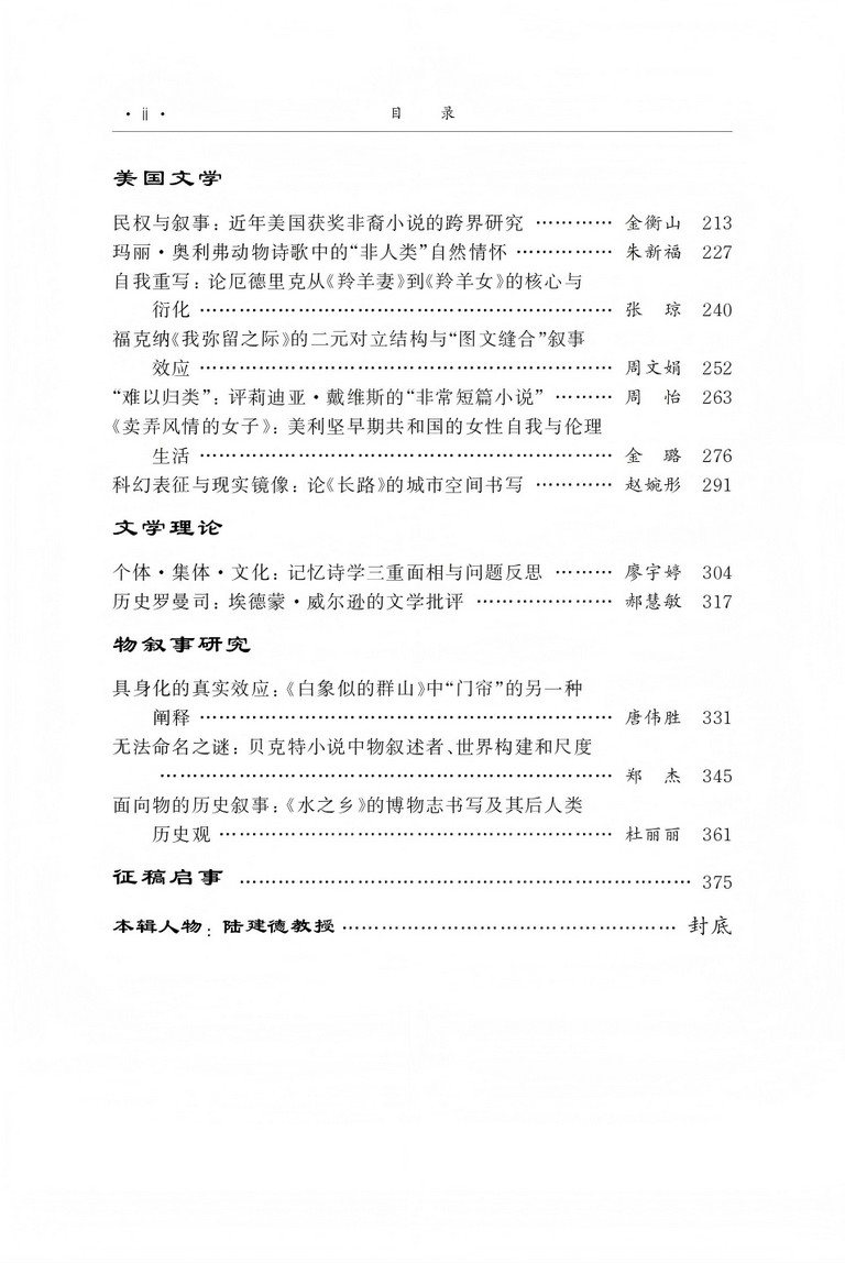 唐伟胜教授与2024级博士生李英华合作的论文《傅修延的物叙事思想探究》刊发于外国文学A&HCI期刊《文学跨学科研究》2025年第2期上。研究探讨了傅修延的物叙事思想,指出其作为中国学界最重要、也是最早思考物叙事并展开研究的学者之一,物叙事思想主要有以下三个方面的贡献:(1)率先提出“文学是‘人学’,也是‘物学’”这一重要观点,并不断探索物的叙事学功能,为物叙事研究在中国的发展与兴起打下了根基;(2)提出物性叙事的三种听觉模式,鲜明体现了中国学者的学术话语创新意识;(3)固守本土传统,兼具国际视野,创新具有本土性和实践性的物质生态批评话语。
