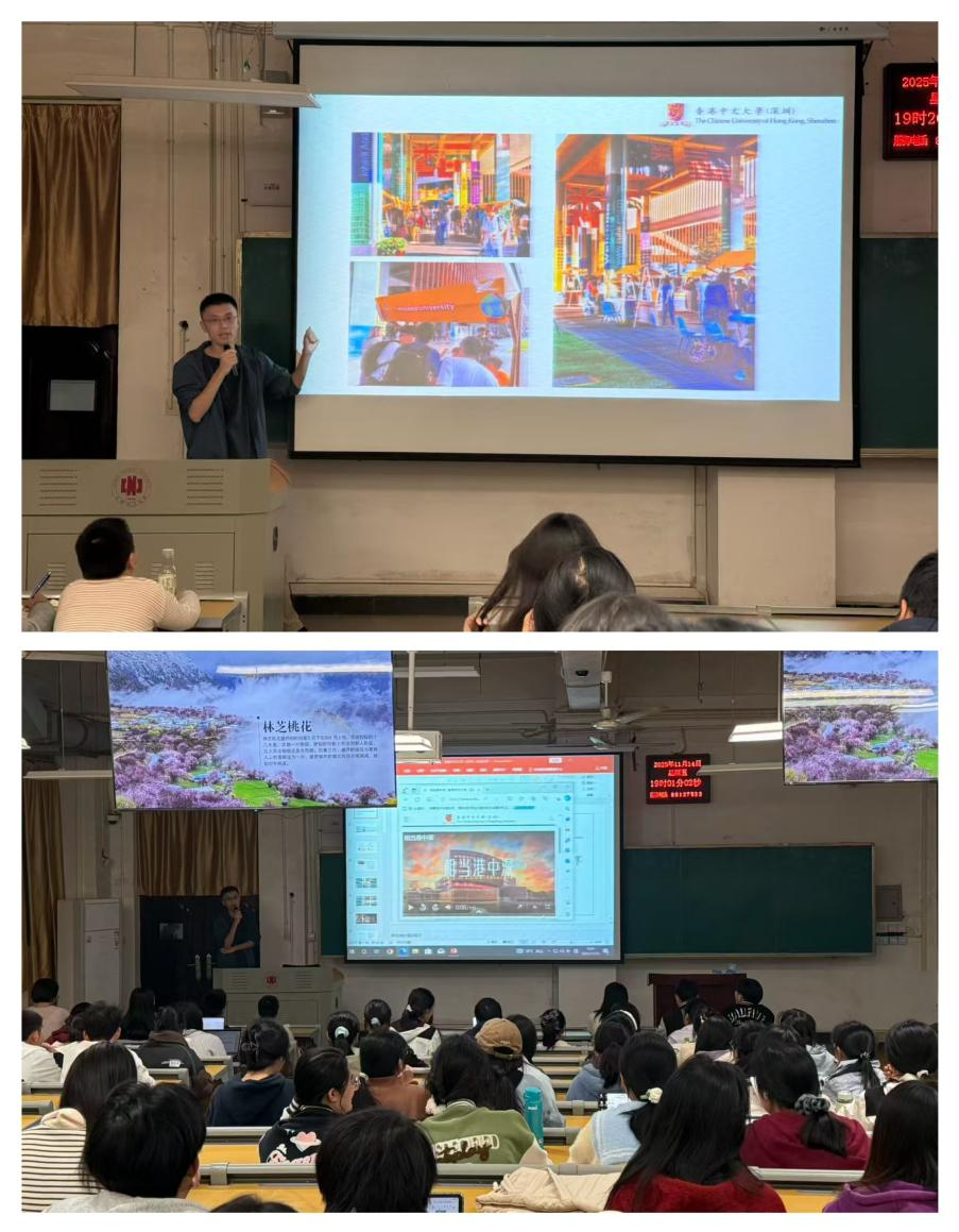 分享中,汪一帆校友围绕“校园体验、社会实践、留学规划”三大核心维度,结合自身经历娓娓道来。他先详细介绍了香港中文大学(深圳)的办学特色、学术资源与校园文化,通过一组组鲜活的实景照片,直观展现了读研期间的学术探索、校园生活与成长蜕变,让同学们真切感受到名校的学习氛围与平台优势。在社会实践板块,他重点分享了参与2025年“一带一路”记者组织论坛活动的经历——以多语言能力为纽带,协助外国青年体验民族服饰、参与茶园劳作,深度解读中国乡村非遗文化,生动诠释了语言专业学子在跨文化传播中的桥梁作用。针对大家关注的留学申请痛点,汪一帆毫无保留地抛出精准到月的申请时间轴,从材料筹备、语言备考到院校投递、面试准备,逐一拆解全流程关键节点,干货满满,让在场学子直呼“实用性极强”。