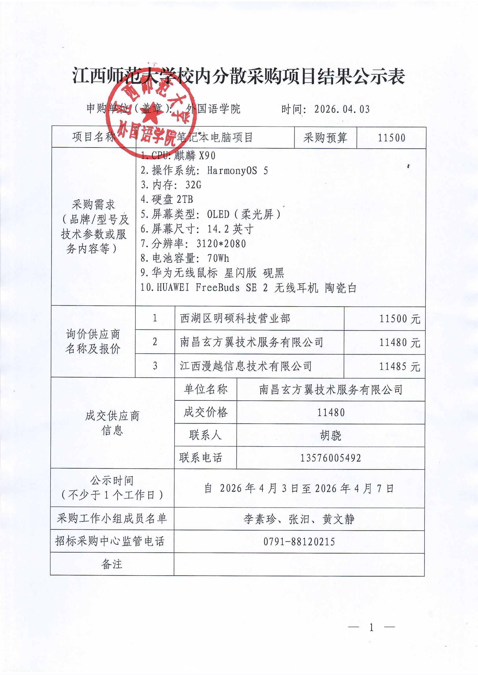 2026年3月外国语学院笔记本电脑采购项目校内分散采购结果公示