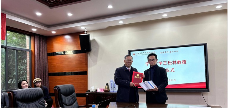 讲座开始前,学院举办了简短而隆重的赠书仪式。王松林教授向学院捐赠了自己所著的《康拉德小说伦理学研究》《寻找被放逐的文学》及主编的《世界海洋文化与历史研究译丛》系列丛书等图书30余册,希望通过图书的捐赠,进一步丰富学院图书资源,为学院的发展贡献一份绵薄之力。谢枝龙院长代表学院接受捐赠,并代表学院向王教授颁发了捐赠证书。
