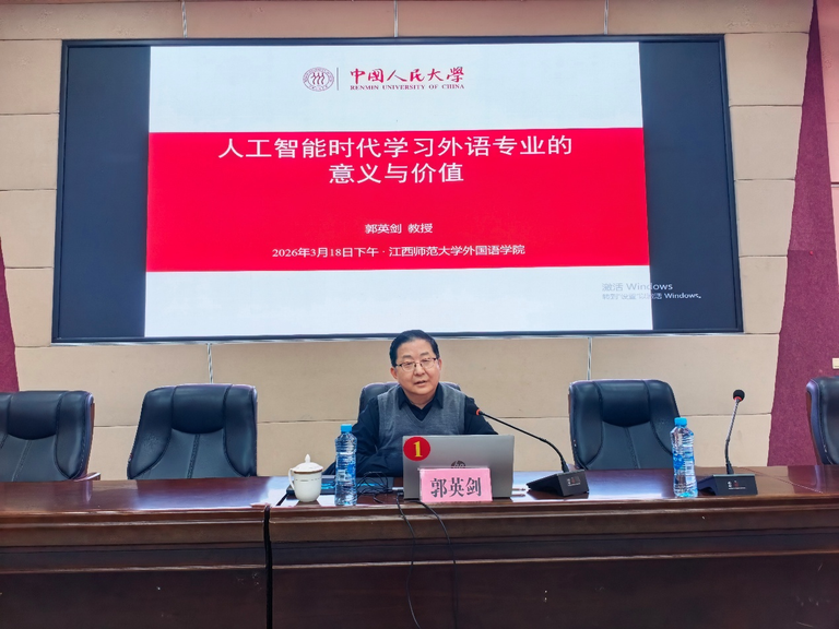 3月18日下午,中国人民大学全民阅读教育研究院院长郭英剑教授应邀为外国语学院师生作题为“人工智能时代,学习外语专业的意义与价值”的学术讲座。本次讲座由副院长胡新建教授主持,学院百余名师生到场聆听。